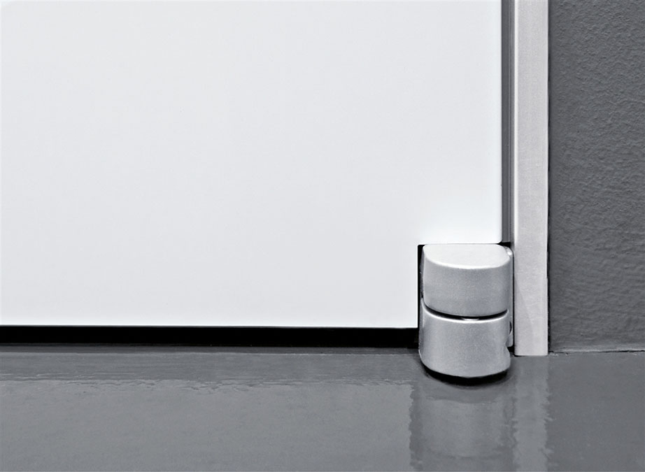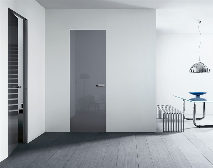 Il sottile stipite e le cerniere esterne in alluminio sono i tratti distintivi di questo modello storico, fondato sull’ idea innovativa di un allineamento perfetto fra porta e parete, per un effetto di grande pulizia formale.